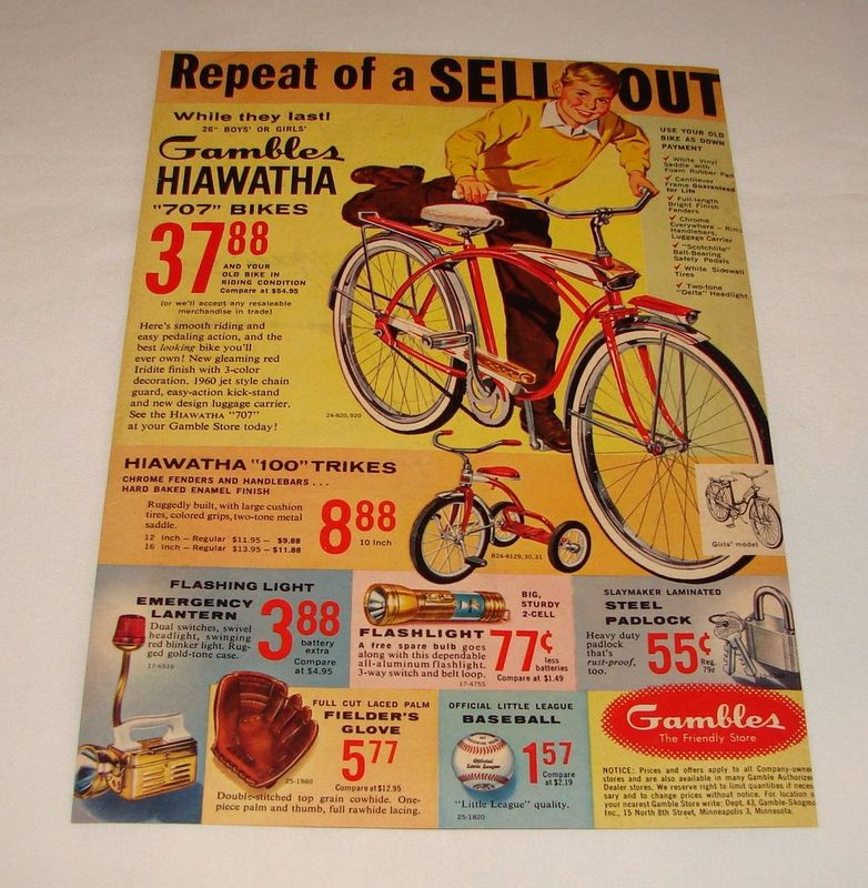 Gambles Hardware and Auto Supply was founded in the 1920's by Bertin Gamble and Philip Skogmo. Gamble-Skogmo Inc. eventually became a conglomerate of retail chain stores including Department , Furniture and Toy stores to name a few. Gambles Hardware was founded in Minnesota near the large wholesale hardware distributor, Farwell, Ozmun and Kirk. F.O.K. had the Hiawatha Brand on many of their goods at the turn of the century. The Hiawatha legend was renowned in that area with public sculptures, parks and trails named after the Native Indian leader. Gambles trademarked their own Hiawatha brand circa 1950 and used it some of their own products such as bicycles and baseball gloves.
