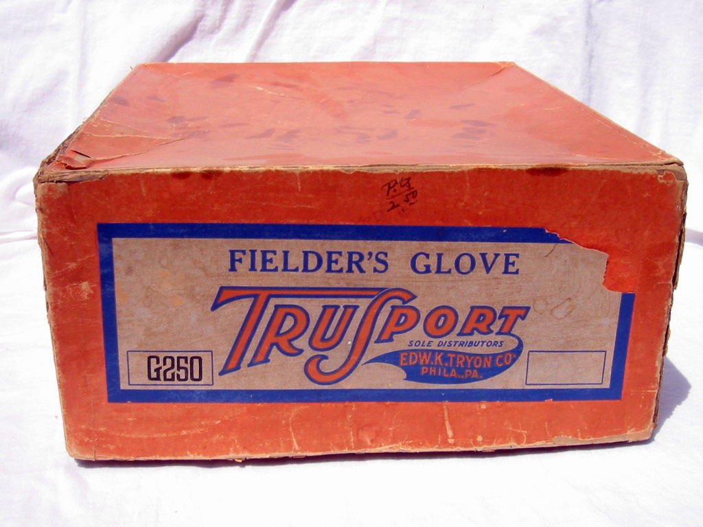 TruSport was a brand name of merchandise distributed by Edw. K Tryon of Philadelphia. Knives, tools and saws from the 1800's were stamped with the truSport brand. Eventually TruSport was used for athletic goods. Below are ads for different TruSport athletic products.This 1950 bicycle badge identifies both TruSport and Edw. K. Tryon Co.This TruSport glove box below identifies Edw K. Tryon as sole distributor.It is interesting that some of the TruSport products do not identify Edw K. Tryon as sole distributor. The box below simply states "Sports of all Sorts"This very nice "Glenn Chapman" model glove below carries the TruSport cloth patch and was undoubtedly made by an independent manufacturer for Edw. K. Tryon Co.