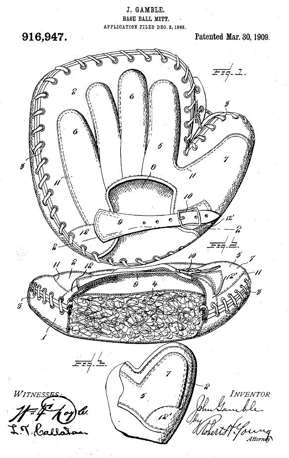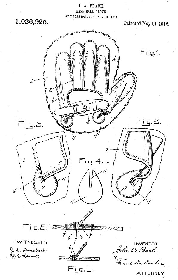 mikesglove wrote:the close-up below of the 1911 Peach fielders gloves shows a unique feature of reinforcing tabs at the base of the thumb and fingers. I couldn't find a specific patent for that from J.A.Peach or anyone else but still pretty cool.