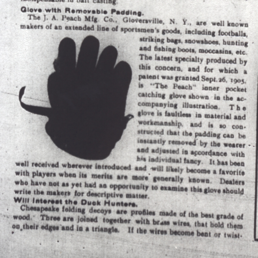 Here is some additional information on the Peach and Consolidated Sporting Goods. The small snippets discuss the removable lining as Mike referenced above. These articles/ads come from 1905 and 1906.