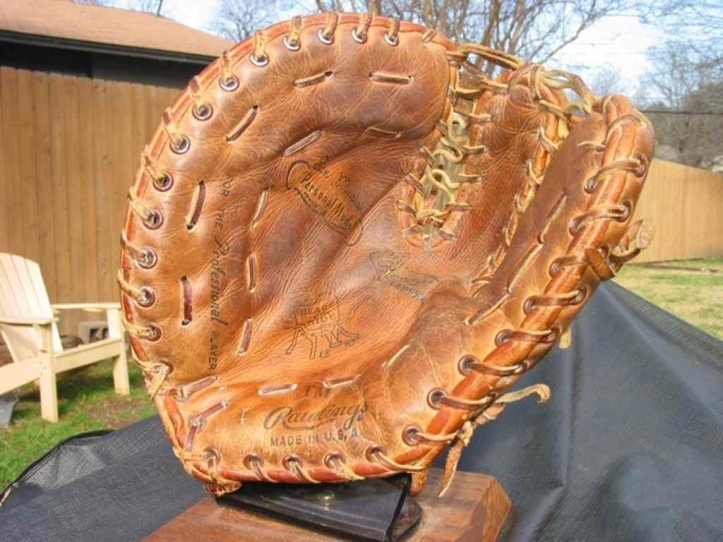 While wandering thru a familiar antique mall seeing a few overpriced $250 gloves, I happened upon a nice 1950s Trapper. Folded over. I opened up a rare Stan Musial Personal Model TM45, only made a few years in the early 1960s anda type mitt Musial might have worn. Smaller than the TMH (very top of the line) about 11" high but second in line as a retail price point. A few years later Rawlings began phasing out its Trappers over to the DCT (one of Lattina's mystery choice names). Anyway here's a shot of the mitt. Nice patina but also plenty of use.