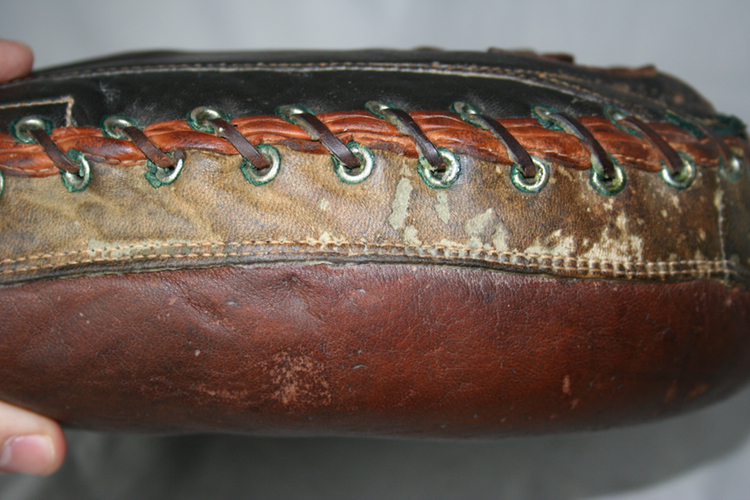 Got this glove out of a local auction a couple weeks back and finally got some pictures of it. It is huge and thick (insert your favorite Michael Scott Office joke here). The mitt weighs 2 pounds!! Like the three tone leather look - don't see that too often. Blazing patch doesn't hurt the eye appeal either.