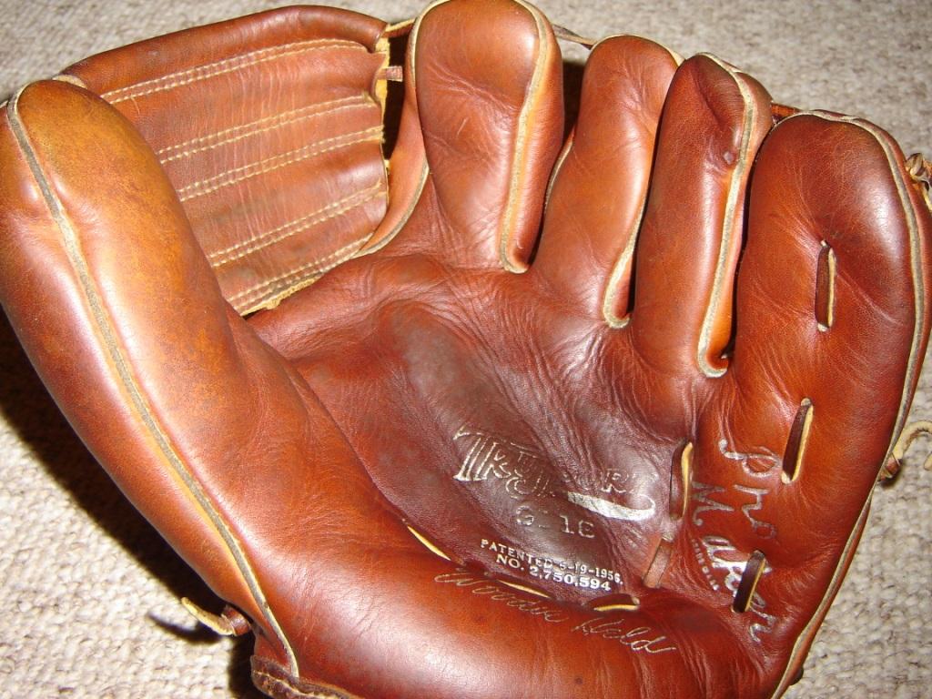 This year my trips to antique shows and flea markets have been seriously curtailed by my other hobby, umpiring. I've been on the field pretty much every weekend, all weekend long, and that has allowed me to attend only a couple of shows. I picked up just one glove all summer- a 1950's JC Higgins #1673 Mickey Mantle endorsed glove. Intrigued by this oddity, I checked the patent number for clues to its origin. It's a Denkert!