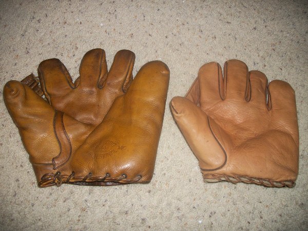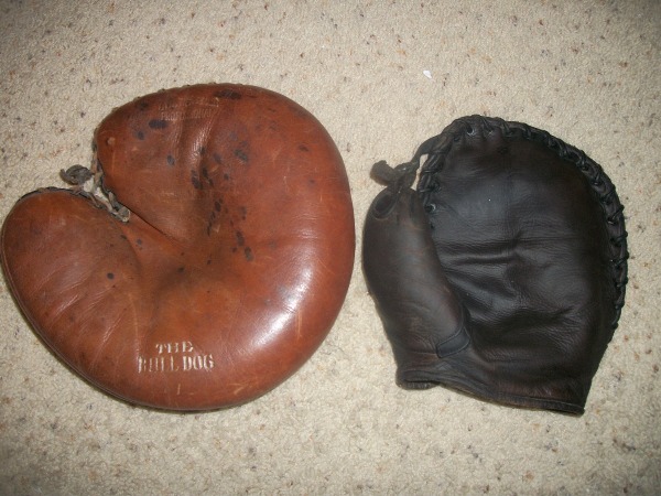 Haven't posted many new additions as of late, so I thought I'd share my Bulldog glove collection. I have a Nokona catcher's mitt, but my main focus are pre 40's Bulldog gloves or mitts. The catcher's mitt is a Goldsmith buckle back called THE BULLDOG. The first basemen's mitt is a Goldsmith as well and features a buckle back closure and buckle web feature also called THE BULLDOG (Big Thanks to VintageBrett on that one). The 40's glove is a Mexican Bulldog Modelo and is a HUGE glove. The last one is a Pennant Bullpup model and is a soft one inch web. I am always looking to add more and dupes to my collection.