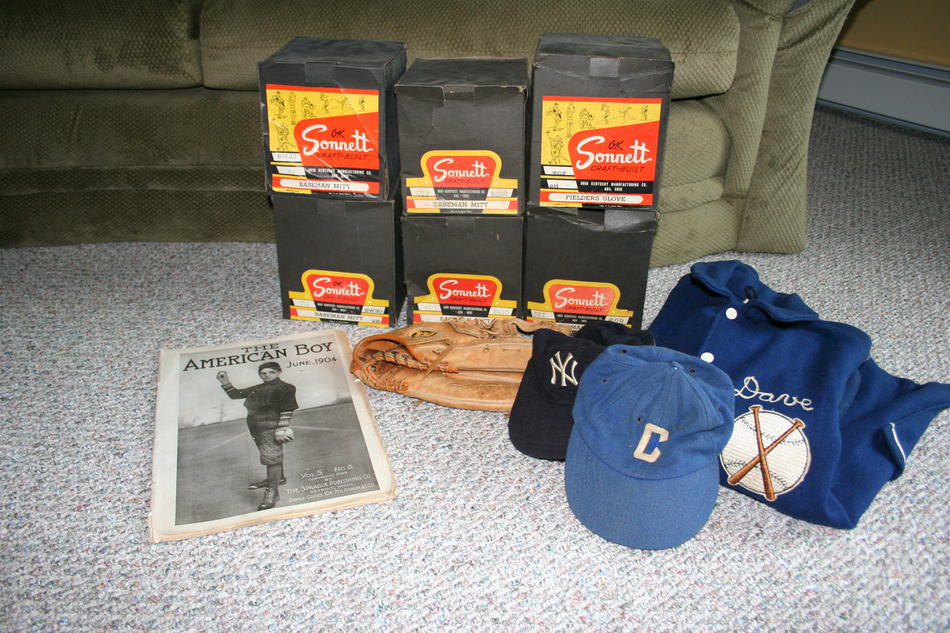 Th show was even smaller than the last time I was there. Saw some gloves but nothing that struck my fancy except a USA Wilson A1000 glove that the modern guys will probably like. I added two vintage hats, including one NY Yankees, plus a nice baseball jacket and a oversized magazine from 1904 with a great picture on the cover. My best buy of the day was 6 Sonnett boxes from Terry and Mike. It was great to add them to the collection. Had a nice chat with Mike and hope to see him at the National this summer. The best part about shows is fast becoming catching up with fellow collectors, rather than finding much of anything.