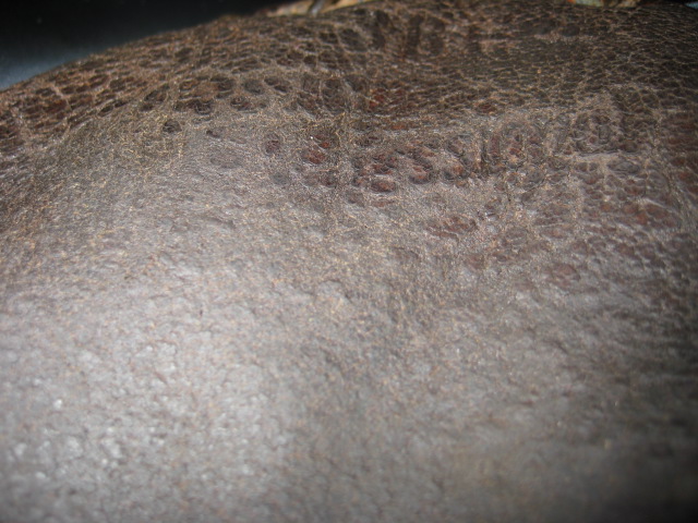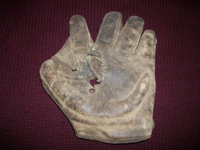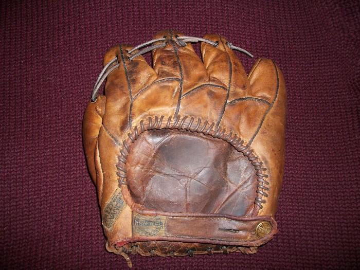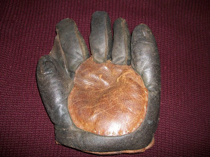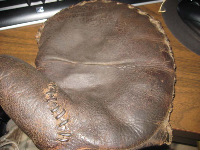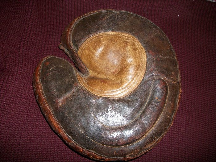 2. Black crescent catcher's mitt with a patched palm. This one is a nice BIG glove with a good feel. Hook and eye back.