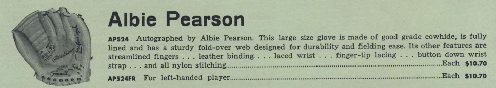 Third was the mint Sonnett model 5448 Mike Hershberger that jeneli auctioned off at the beginning of the month. I had let this glove slip through my fingers once before and wanted to make sure to get it the second time around. It was an upgrade over the one I had and now I don't have to worry about finding another (unless it has a box). This glove is from the 1965 line but unfortunately I don't have the catalog to post a picture from.