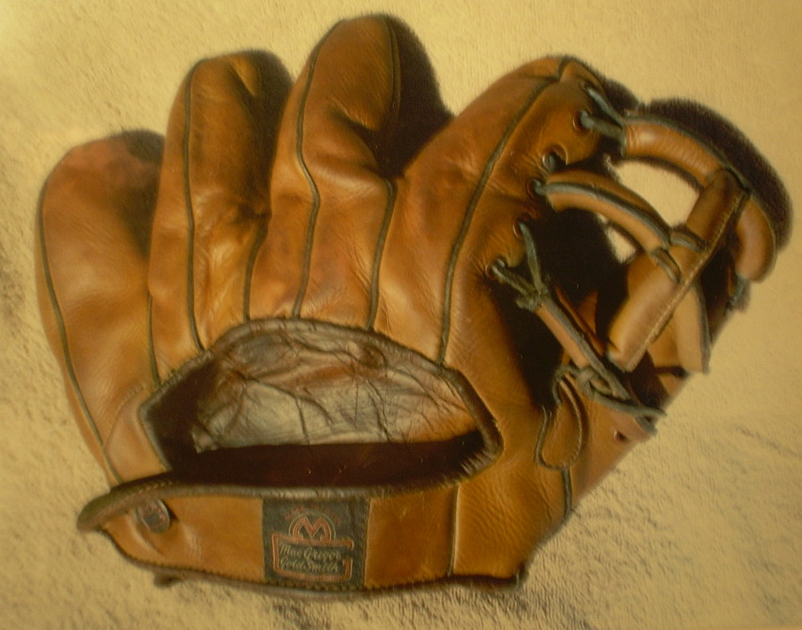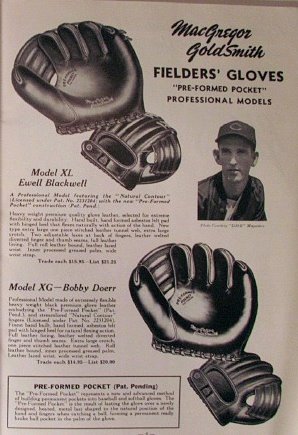 JD just uploaded a mostly complete glove section of the 1949 Macgregor Goldsmith catalog at http://www.baseballglovecollector.com Being a big fan of the McG's, I was delighted to find this catalog on ebay. The catalog features my favorite models, the "Snare" gloves and mitts. the catalog also features a lot of collector favorites, such as the Ewell Blackwell, Bobby Doerr and Pete Reiser gloves. The newly purchased "Carmona " basemitt above will look nice next to my MacGregor Goldsmith "Snare" model AH "Les Fleming" below