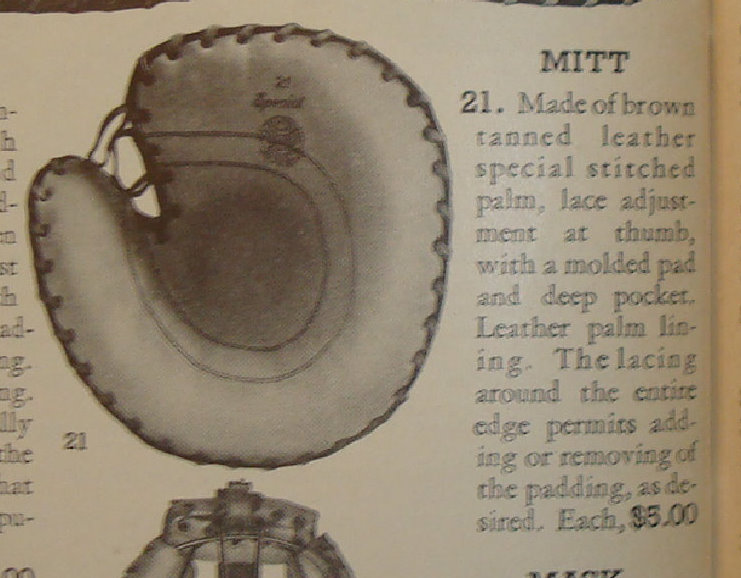 the section of the palm inside the stitching looks newer than the outside, so maybe there was another layer of leather stitched as pocket reinforcement that eventually was lost when the stitching wore off. The mitt looks to be around 1935 or newer because of the wrist strap and appears to be of mid level quality so maybe it was meant for the youth market. I have seen youth models with some older features like the reinforced pocket to protect the hands of young players. Maybe the stitching was all that was visible and the canvas reinforcement was under the front face. Did the stitching delineate a raised area around the perimeter of the face? In that case it may be softball. Just a guess. Don't have any idea of the brand but here is a 1935 Spalding catalog illustration of a mitt with what is described as a special stitched palm.