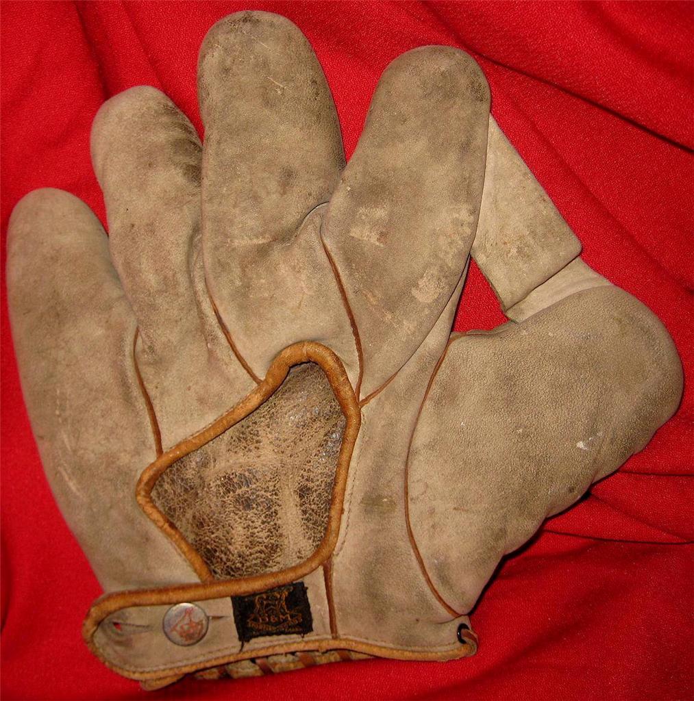 The bargain of the month is this full web Goldsmith glove for $64. the glove looks small in the photos but is easily adult size. The front looks stiff and tattered but is only wrinkled from a lack of inner padding. The reddish leather is still intact and very soft. The inner lining came loose at the heel and the padding fell out over time. Other than that the liner is intact and nice all the way up into the finger stalls. The rare celluloid button and red/white patch are pristine.