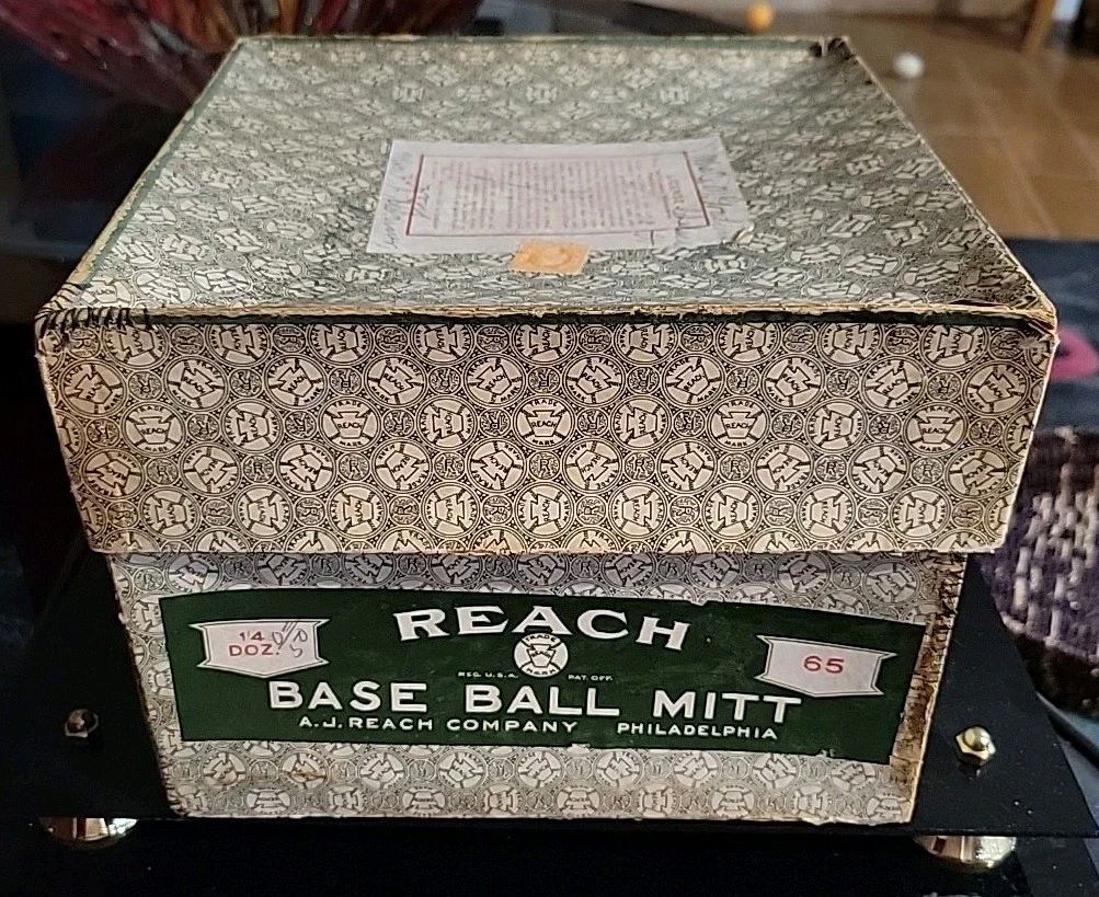 An interesting Reach catchers mitt box sold for $375. It's from the teens. It is a large box that held a dozen or so model 65 BOTL mitts. My guess is the mitts were sent in bulk to a distributor. I like the graphics on the box.