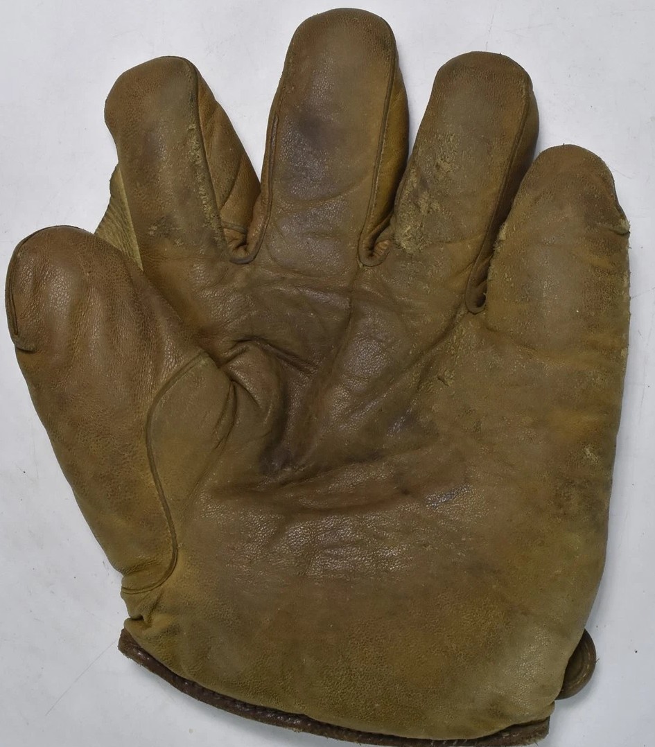 a sewn full web Spalding glove sold for $169. An all leather midline model in excellent condition. The patent stamp on the back of the finger stall is pristine.