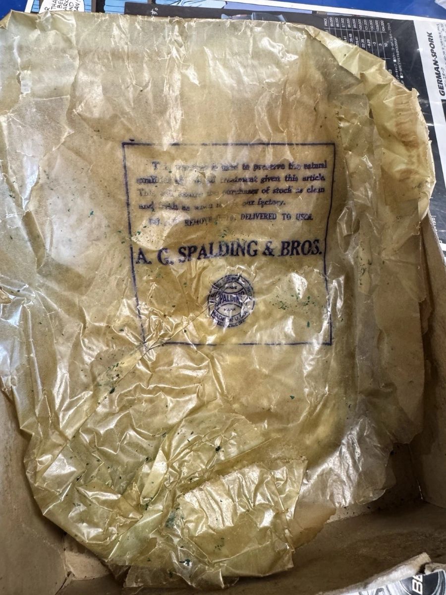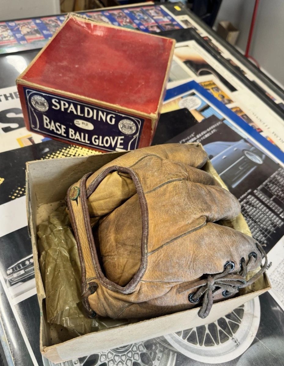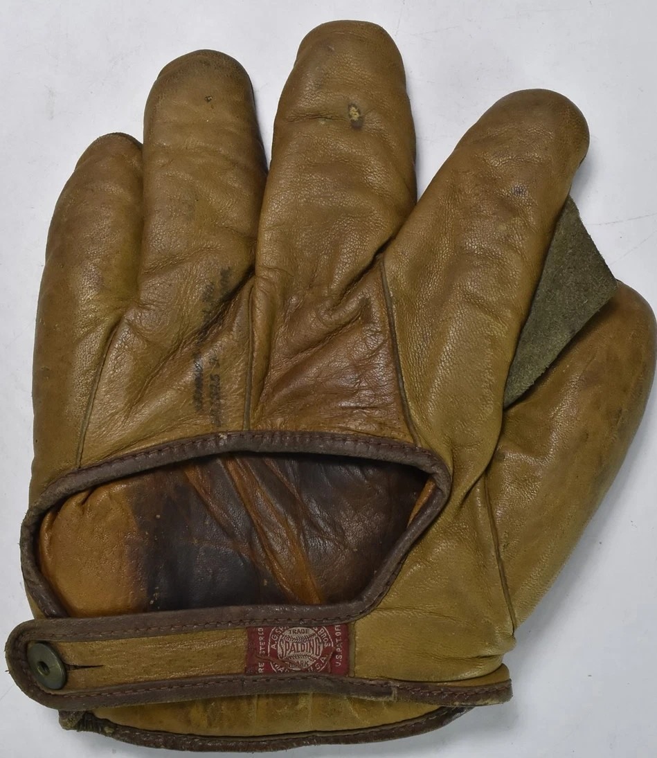 A 1930's Spalding glove with box sold for $600. A lower line glove with a pretty nice box. The Spalding paper wrapping inside the box is a nice addition, probably the rarest part of this ensemble.