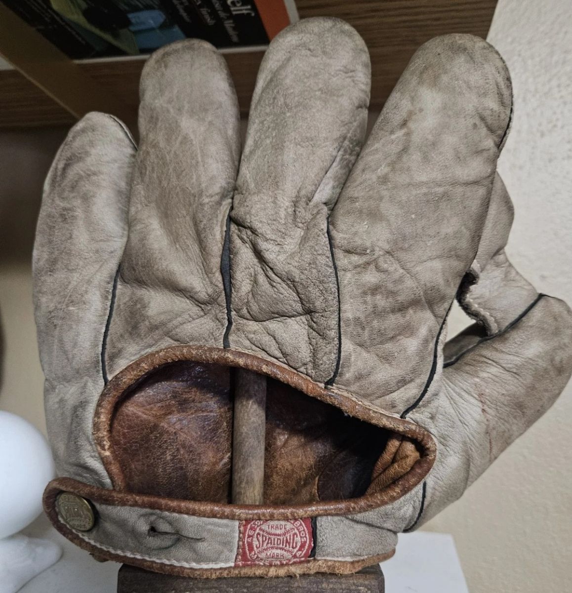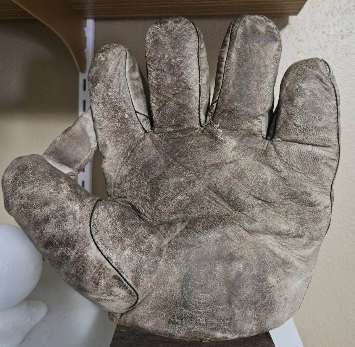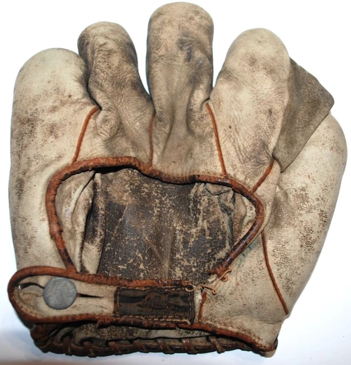 A 1921 Spalding sewn web glove sold for $112. Originally sold as the model SS "Leaquer" model in the teens. It was one of Spalding best gloves BITD. By the 1920's it was retailed as the model SS "Short Finger" model. You ca still see the "SS" stamp and the "S" of "Short Finger" on the palm of this glove. Hard to find a white leather model like this with the pocket stampings mostly intact. The glove is in fantastic original condition and a bargain at that price.
