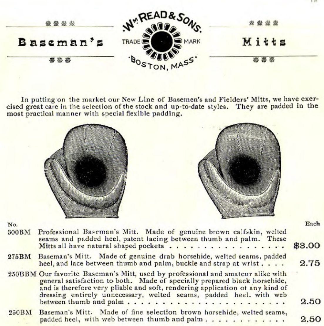 A 1906 William Read base mitt sold for $49. It has a crescent pad and a segmented face. Only a few know examples of that style and possibly the only known William Read example.