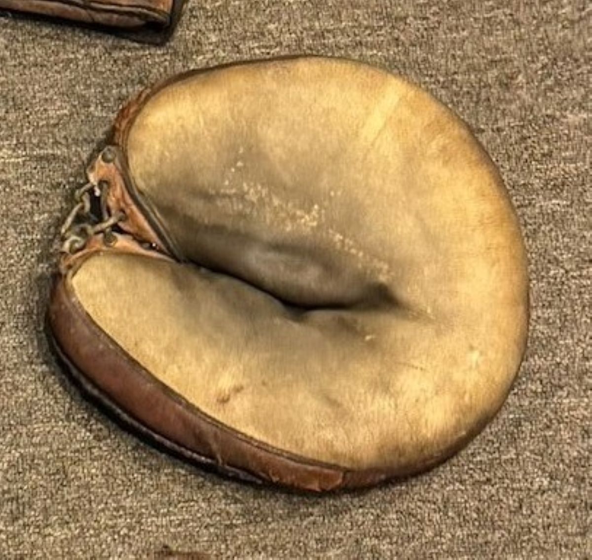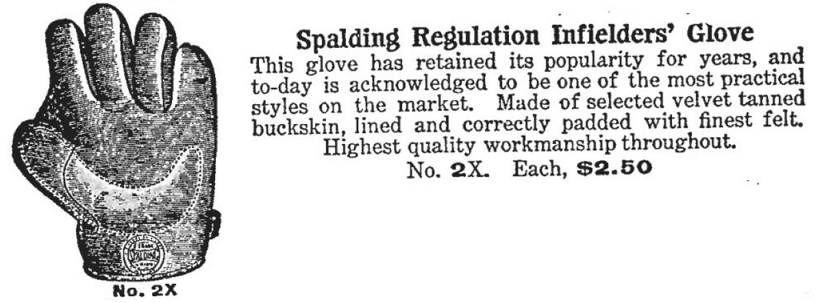 Listed as nineteenth century, it's actually circa 1908-10. The white leather Spalding crescent pad sewn web glove sold for $450. It's top quality, in fantastic condition and a bargain at that price. The felt lining is basically unimprovable. The cloth tag with "A.G. Spalding Bros. Makers" is an early one. The glove features the 1908 patented diverted finger seams. Given all that, the glove could be the model 2X. It was the only crescent pad model Spalding offered in that time period.
