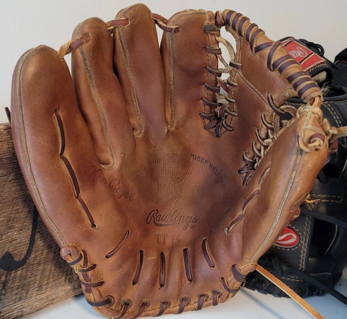 My last post and this post should probably be located in the glove conditionig and restoration category but they are both in reply to Mikes post ahead of them regarding relacing vintage gloves with thicker modern lace. Below are two pictures from JD's website of mid fifties Rawlings gloves that clearly show skived lace being used from the factory. Note the yellow or almost white appearance on the back of the lace.