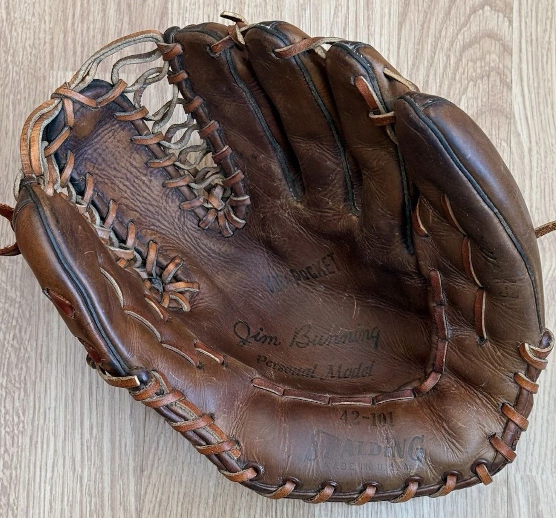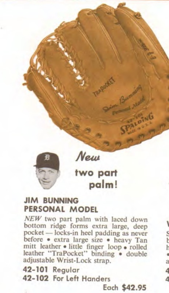 A rare 1962 Spalding Jim Bunning model 42-101 glove sold for $130. a one year only model featuring the EZ-Flex two part palm. It looks like the Rawlings model TGP from that period. The condition is OK with some wear. The factory markings and patch are good. Overall a swell glove.
