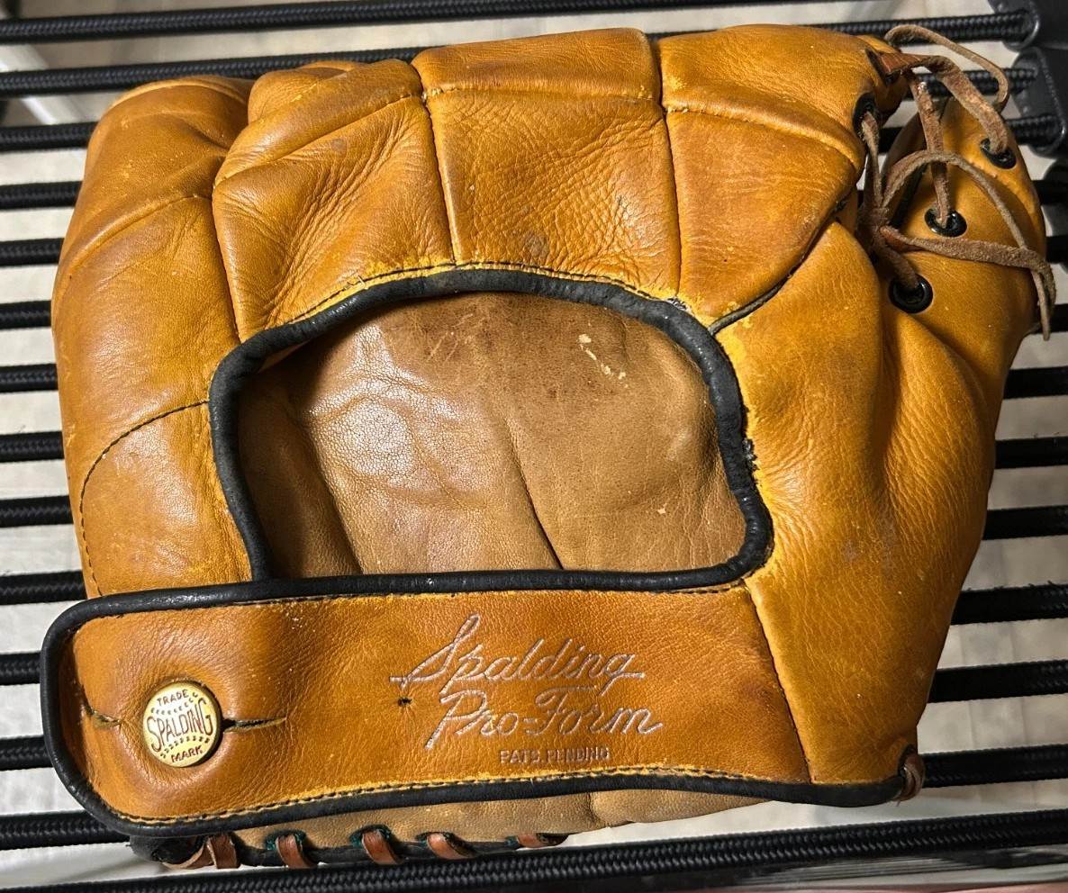 A rare 1940 Spalding Joe DiMaggio Pro Form model glove. This one has the segmented finger stalls. Surprised it only 7 day auctioned for $136. In my mind it's a $250-$300 glove all day long. The ebay photos and description didn't do it justice. There is a Pro Form DiMaggio model out there with cloth piping but this one is all leather and the condition of the glove is unbeatable.