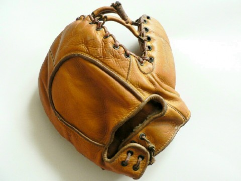 A vintage J.C.Higgins catchers mitt sold for $70 on ebay. The mitt still has the riveted wrist opening so it may be circa 1910-15. John Gambles patent of 1909 sought to eliminate the rivets in favor of the glove portion of the mitt being anchored to the perimeter lacing. This mitt appears to have both features and may be in a transition period. It is in real good shape with high quality construction. Nice cloth patch.