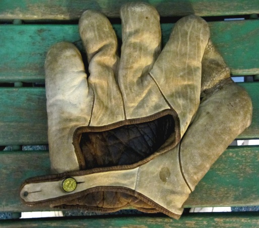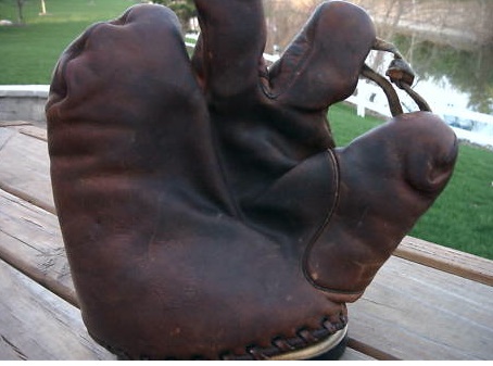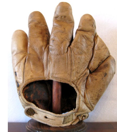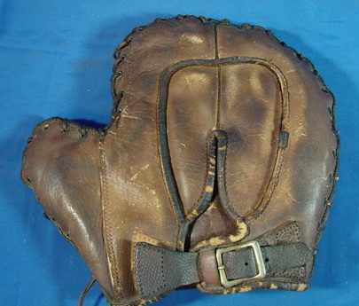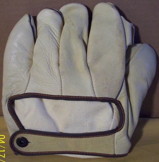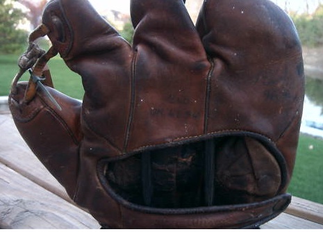 This George Kelly is beat to hell, but very intriguing. First off, it has problems. It needs a good cleaning, it has to be relaced and the buckle strap must be resewn. Whoever won it, please contact William at Huntington Base Ball Co. to do the job correctly. Just trust me, you won’t be disappointed. Now, what fascinates me about it is that it is the only Goldsmith Kelly I’ve encountered. I’ve watched endorsed gloves for more than 20 years, and I’ve never seen another, though I could be mistaken. Goldsmith had some of the earliest endorsements, so there is a high probability this could be the oldest Kelly found. Beyond that, I love the odd shape of the “V-notch” on the back of the mitt. One cool mitt that a smart buyer got for only $169. I’d love to see it after it’s been attended to.