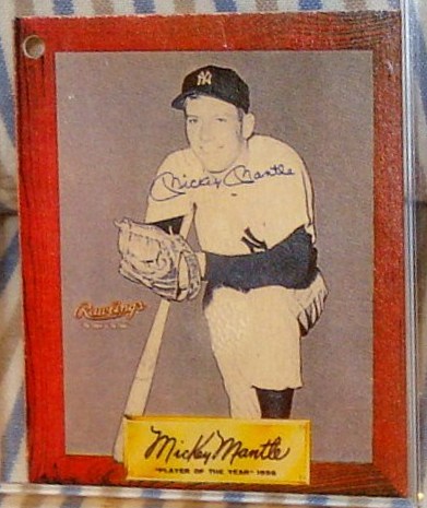 A couple of glove hang tags, both from Rawlings Mickey Mantle model gloves. The first sold for only $21. I remember some earlier discussion of the 2 signature styles on the tag being suspicious.