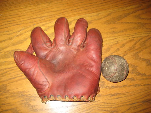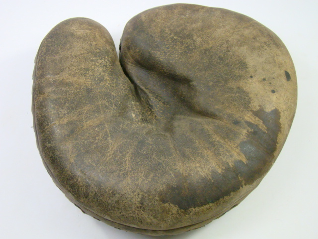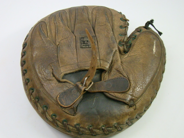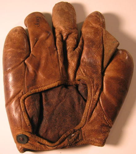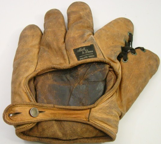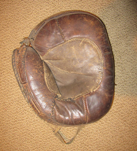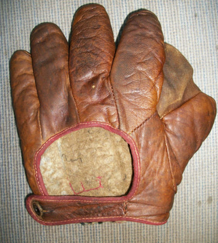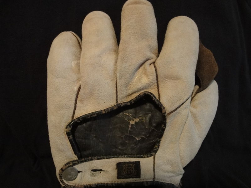 Great job in finding and describing these old gloves. I enjoy your commentary on them. By the way I was the one who ended up buying the cool tri-color (black glove, brown thumb and cream piping and web and liner) old time full sewn web Reach glove with the funky spider/diamond cut web a few weeks ago. It may be a period alteration by someone but I have not ruled out it being a die-cut stamped out web either. Either way, it sits on the top shelf of the glove loft with some other cool funky webs.