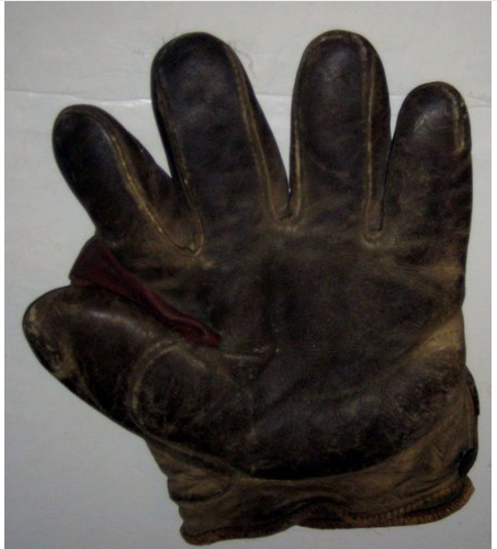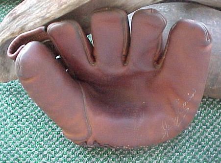 A 1930's Spalding "Sam Leslie" model base mitt sold for $148. Expensive in its day and rarely seen now. Top of the line quality. Has the unique snap back wrist strap that Spalding/Reach used from the 1920's till the 1940's on some of their top mitts. I like the vintage athletic tape on the home made web. To me that adds a lot of character to the mitt.