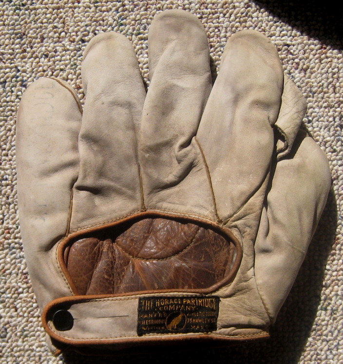 A 1915-20's Horace Partridge 1" web glove sold for $456 on ebay. the glove itself is in pristine condition with nice markings in the pocket which are pretty rare with this type of white leather. The glove also features a variation of the Stall & Dean patented pocket. The circular stitching inside the wrist opening defines an area where the padding was reduced to more quickly form a pocket on the face of the glove. Also, a great cloth patch and only a minor flaw in the inner lining.