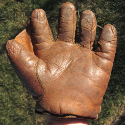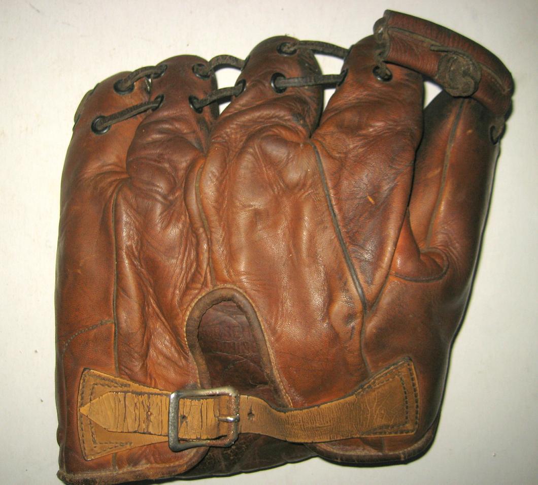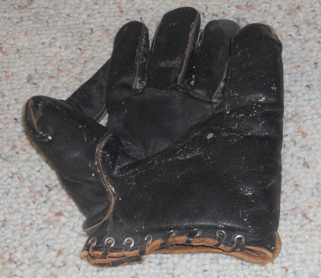 mikesglove wrote:A nice find on ebay. A black leather 1" web glove sold for $30. Looks to be a full size model with leather piping and in great shape with just a little cleaning needed. No manufacturer mentioned]