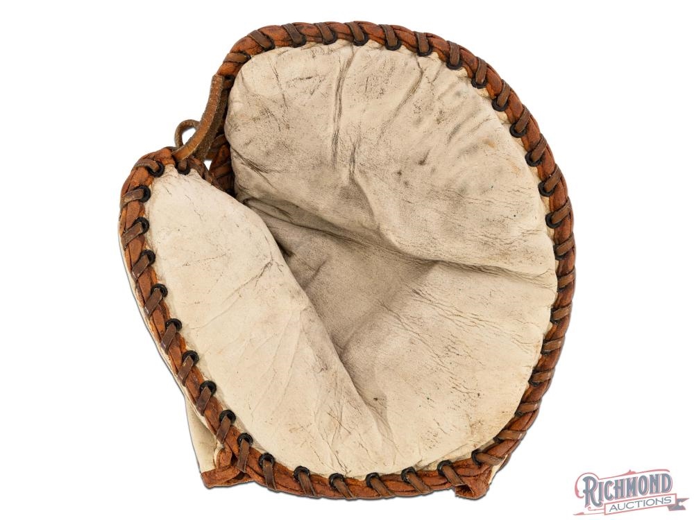 A 1920's sewn web glove sold for $75. Stamped Genuine Horsehide. There is a mfg. name in an oval below but I can't make it out. The glove looks well made.