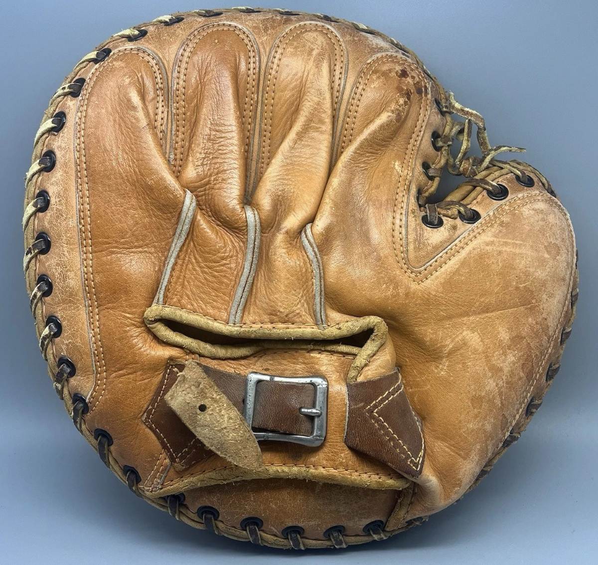 A rare 1920's double buckle Winchester base mitt sold for $499. It has a fair amount of wear but looks all intact. Looks to have been made by Wilson and very similar to the Ray Grimes model 551.