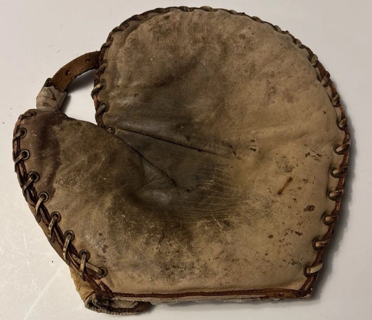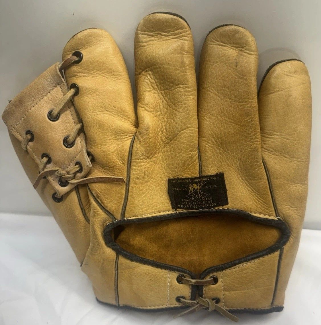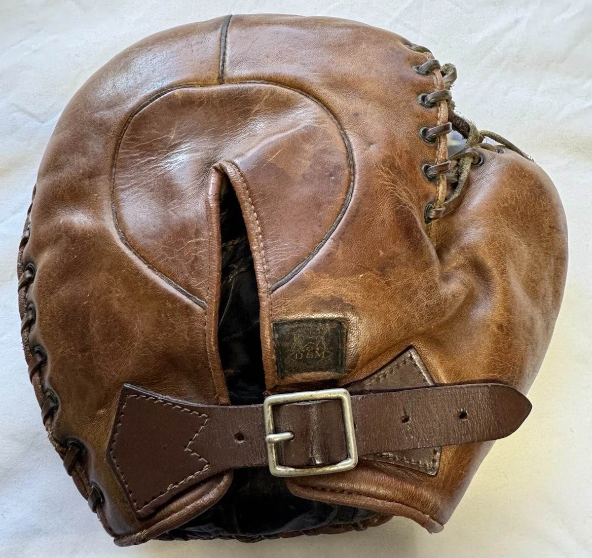 A circa 1908 flat top D&M catchers mitt sold for $30.The cloth tag is worn but the mitt is identified by the patented perimeter rubber guard band, patented grommet web, oval buckle and wrist strap design. It was made after D&M abandoned the early 1900's adjustable heel lace. It has a lot of old repairs which adds to its vintage character.