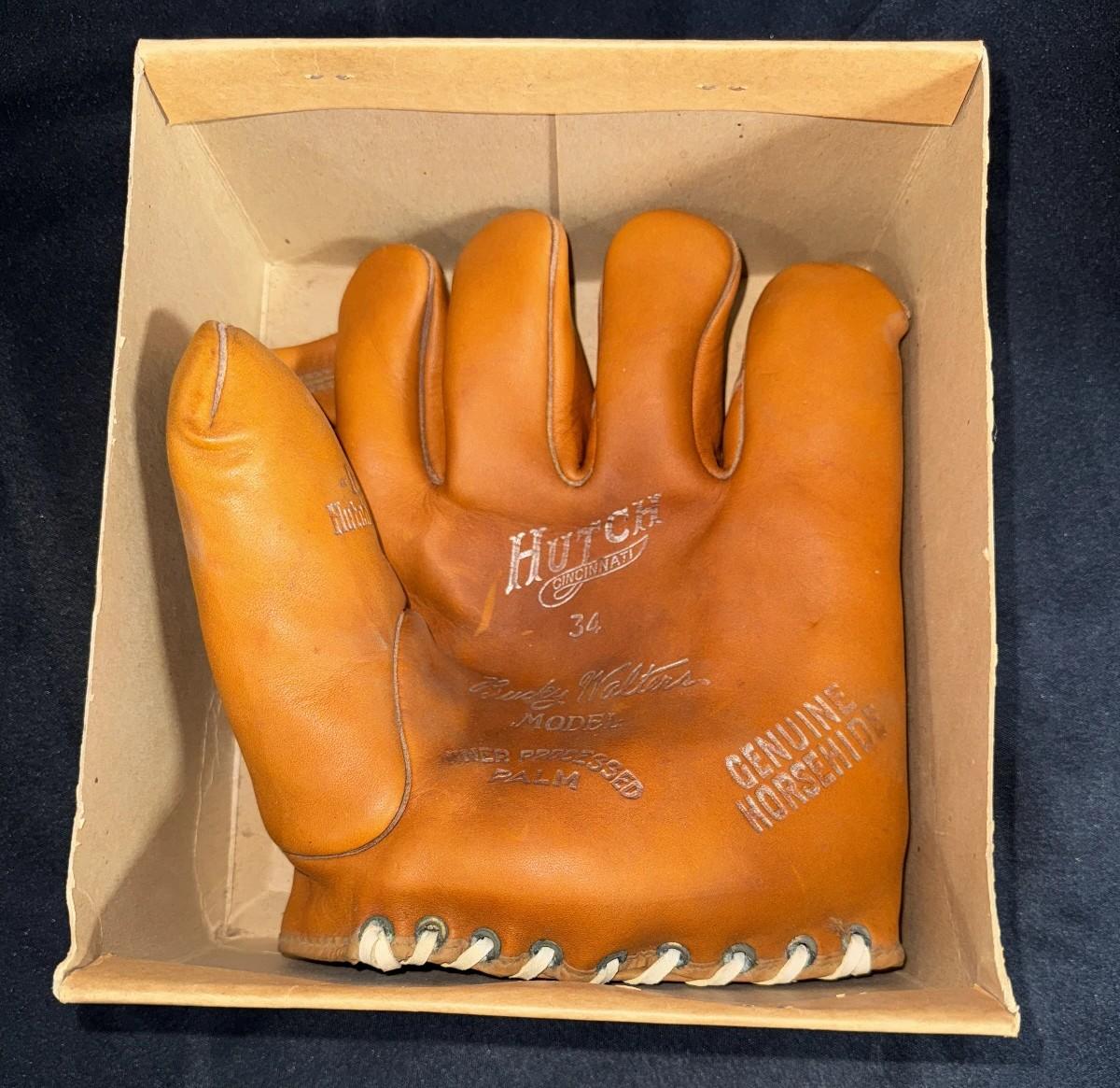 A 1940's Hutch Bucky Walters model 34 glove with matching box sold for $380. glove looks to be NOS and the box EX+.