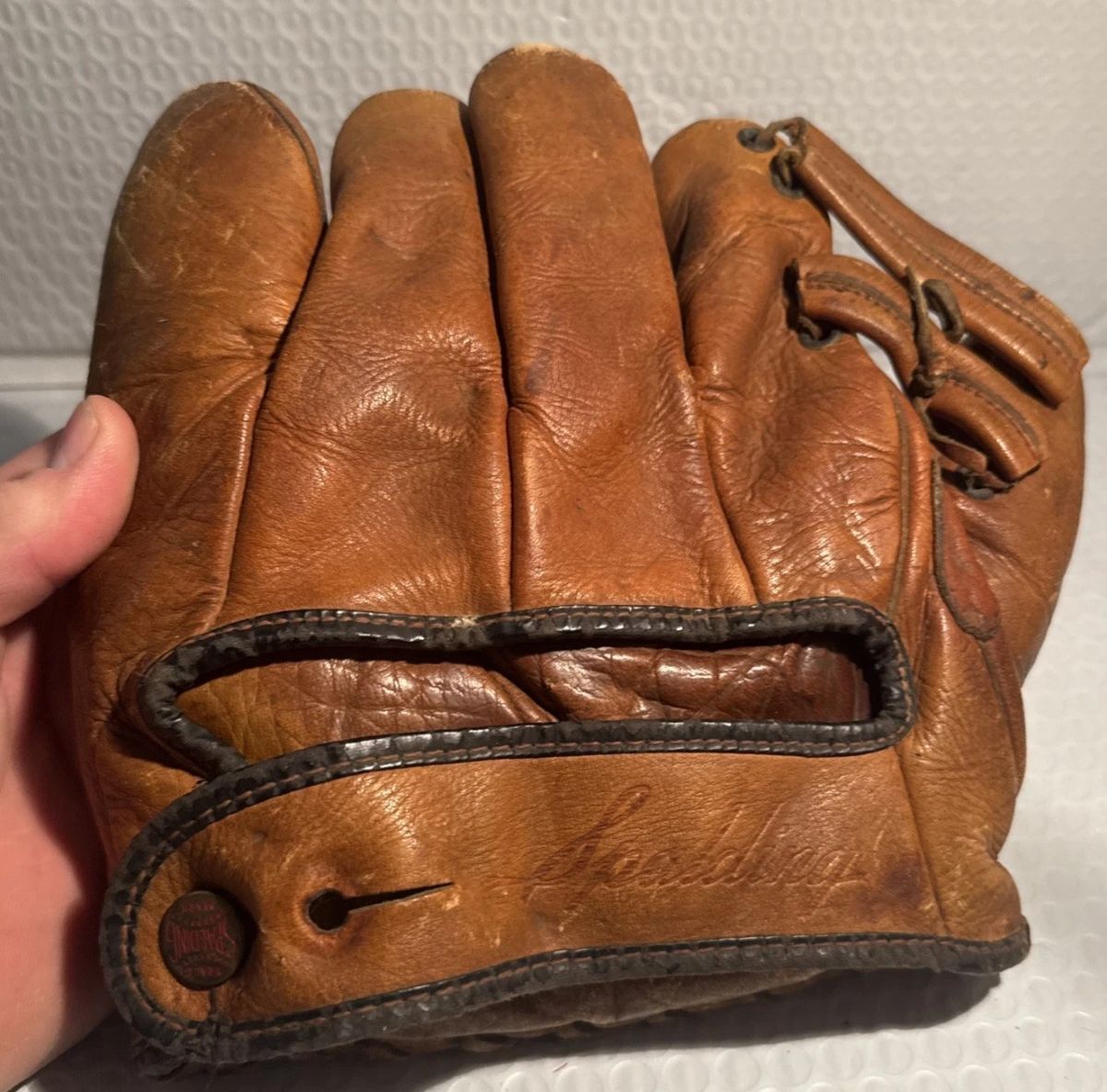 A misidentified Spalding glove sold for $37. It's a 1938 Robert Rolfe model 222-12 glove in pretty nice condition. The seller added new webbing and it's reminiscent of Goldsmith models of the period. The period correct Rolfe glove actually had a lace web.