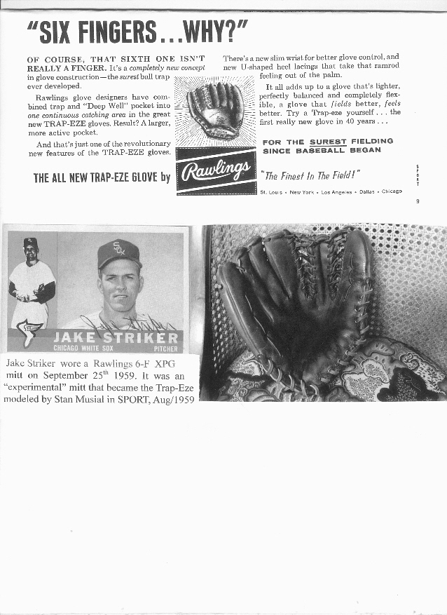 Here is a picture of the mitt Jake Striker used the day of his "one-win". It was the "experimental" Rawlings XPG six-finger. ""Six Fingers...Why" was an ad in SPORT August 1959, with a Trap-Eze modeled by Stan Musial (his picture deleted here)