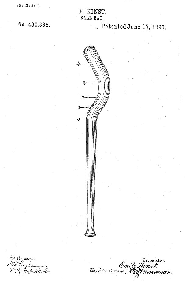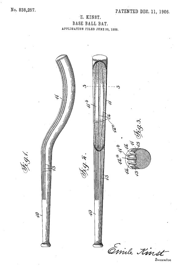 The idea behind this patented bat was to enable the batter to more easily hit the ball to the side of the field he wished and also keep the ball in play instead of foul tipping. This was accomplished by curving the barrel so the ball could be struck at different angles and also running longitudinal grooves along both the handle and barrel to expand the sweet spot of the bat. The concave section was also flattened somewhat to gain a broader hitting surface. Kinst made 400 of the bats and gave them out to various players in an attempt to have them accepted. The MLB rules committee quickly put a stop to that and would not approve the bat for use.