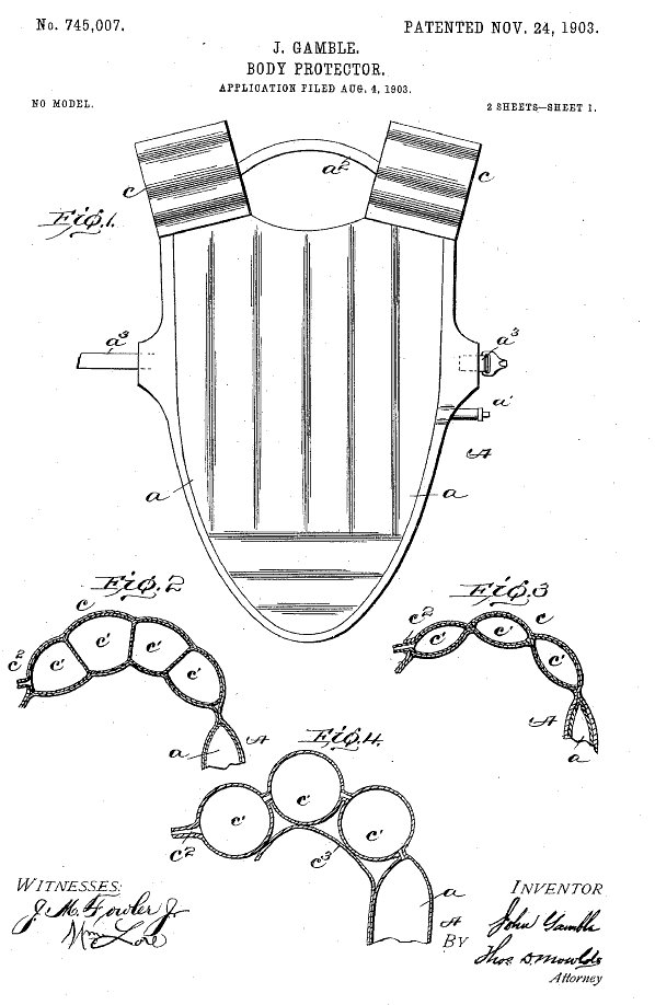 This 1903 patent by John Gamble for George Reach was an improvement on the earlier invention by the addition of the shoulder pads.