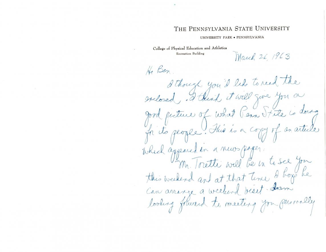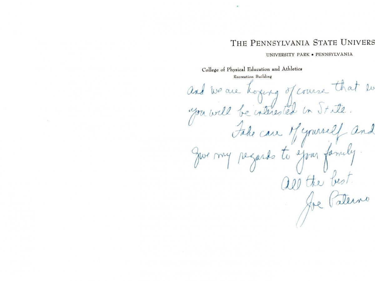 Found this at a local estate auction. Ended up spending more than I had hoped but still was very very reasonable. This is the first all hand written recruiting letter that I have seen the ones that are usually up for sale are the typed form letter that is just signed JOE. The content is great and is written before Paterno assumed the head coaches role. I am planning on selling this one if the price is right but as for now it has a new home. I think for a Penn State fan it is one of the nicest JoPa items that I have seen.