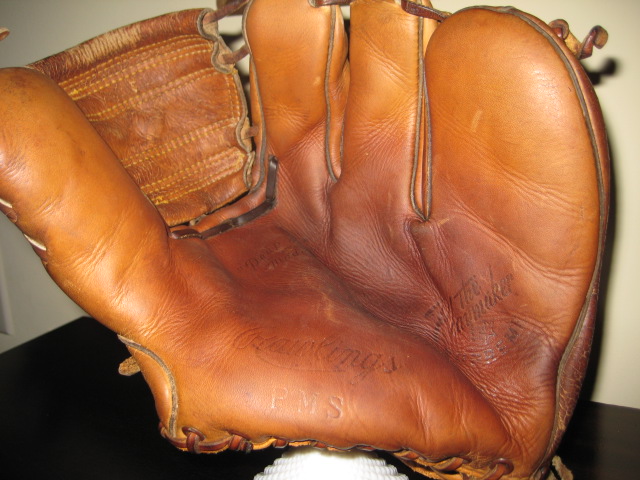 I have a Rawlings Playmaker Supreme Model PMS that I woud like to sell or trade. This top of the line (1950/51) glove is in great condition with a really nice patch, some silver still left in the stampings, liner is smooth, and it has a nice Rawlings shield button. Only flaws are that it has some leather on the pinky that is a little rough and there is a sort of "snugger" strap under the wrist strap and the lacing is broken. This glove will display well and the best offer will take this top of the line glove. If interested send me a PM or email me at richb34@comcast.net.