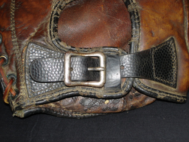 Offered is a circa 1920’s double buckle, Goldsmith basemitt signature endorsed by Jake Daubert. This scarce mitt/endorser is in excellent condition and features two tremendously strong buckle fixtures and the boldest and strongest of markings/endorsements. I must note that a hole in the interior of this piece was restored/repaired using a swatch of leather from another antique mitt so as to maintain its vintage integrity.