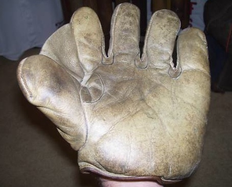 A few more things to help clarify this "workman" or "not a workman" argument (for when it pops up again, which it will). While there were very likely to have been true workman's style gloves (intended for use as a laborer) that made their way onto the diamond, it would be nearly impossible to prove an old work glove's history as being strictly, or partially, tied to baseball. The term "workman" as it relates to baseball can also be misleading, or at least debatable as styles changed and progressed. Generally speaking, the workman's style baseball glove should be roughly the shape of the natural hand, not in the shape of a baseball catching device (fat fingers, elongated fingers, wide palm, webbing, etc.) The same can be said for a laborers glove, it would be snug throughout the entirety of the hand. That said, gloves that were manufactured in the workman's style for specific use as a baseball glove, were, at least, partially padded in some form. These were intended for a specific purpose on the ball field and they were designed to meet the given objective, which was to protect the hand from a sharply thrown or batted ball. A laborer's glove would have only protected against abrasion. Most full fingered ball gloves from the 1880's would have been used by a catcher (or in the outfield by a mollycoddle) and would have had some sort of palm padding at minimum. Both the lining, and the padding, would not be present in a work glove intended for labor. So, while the argument against a workman's style ball glove having a crescent pad is correct, it would have padding of some form, be it leather or wool/asbestos.