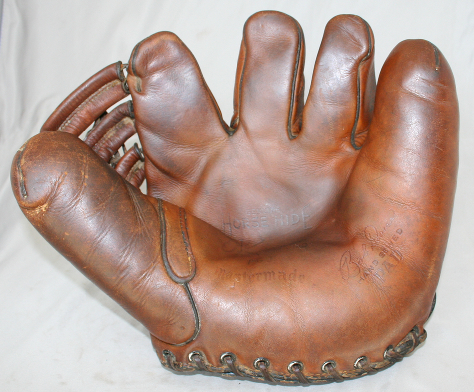 The annual Brimfield Antiques show is this week so we trekked up there early this morning in freezing temperatures to see if there was anything worth buying. Had a good day buying and selling. Picked up some gloves inlcuding an OK Doerr model I didn't have, a 1920's Winchester, 2 late 20's Goldsmiths, a JC Higgins catchers mitt, a Ken Jones split finger, a Cliff Heathcote split finger, a more modern Nokona Kangaroo glove. Bats included a Kren Spcieal, Simmons Swatter, LS 40LG Gehrig, Ted Klu/Chuck Klein pro models (post career). Picked up a sweet lot of press photos and a pair of OK boxing gloves - they have a sewn tag - first pre 1950 OK item I've seen with a sewn tag.