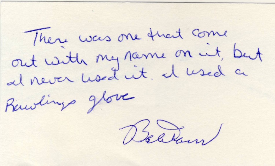 Even though it's not the news you were looking for, that's a fantastic note! Mr. Doerr is such a gentleman. I had the pleasure of meeting him a few years back and had an absolute blast speaking with him. Have you reached out to the rest of the surviving OK/Sonnett endorsers? Actually, an interesting project would be to get in touch with a slew of ex-ballplayers (those who played pre-1960, for example) and ask them if they recall the make/models of the gloves they used and if they remember the details of any endorsements they had (no matter the manufacturer). Would make for a cool reference database.