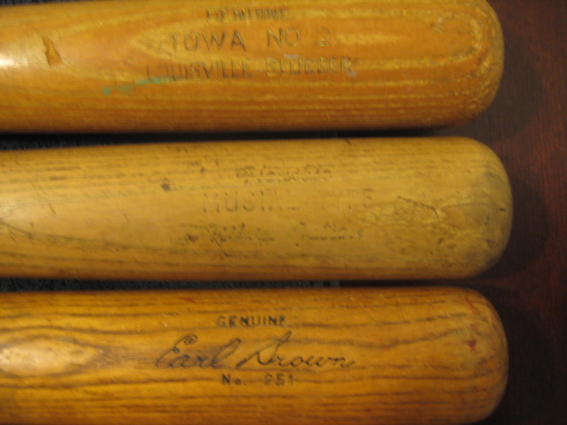 11.) Louisville Slugger bat-125 block letter Iowa 2- 34" I thought this might be a collegiate bat it had a bunch of tape on it a I did the vibration test on it and was sure it was uncracked. I unraveled the tape this morning to find 3 nails and a crack. Still a solid bat.