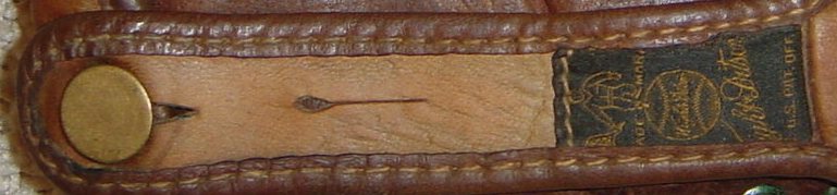 In contrast to this, is my favorite double patch model, the early "Bill Doak" Rawlings model. I love the "Rawlings" Shield design. There is a lot of information presented here in these two patches in a very neat and tidy way, all presented between the rolled leather piping of the narrow wrist strap.