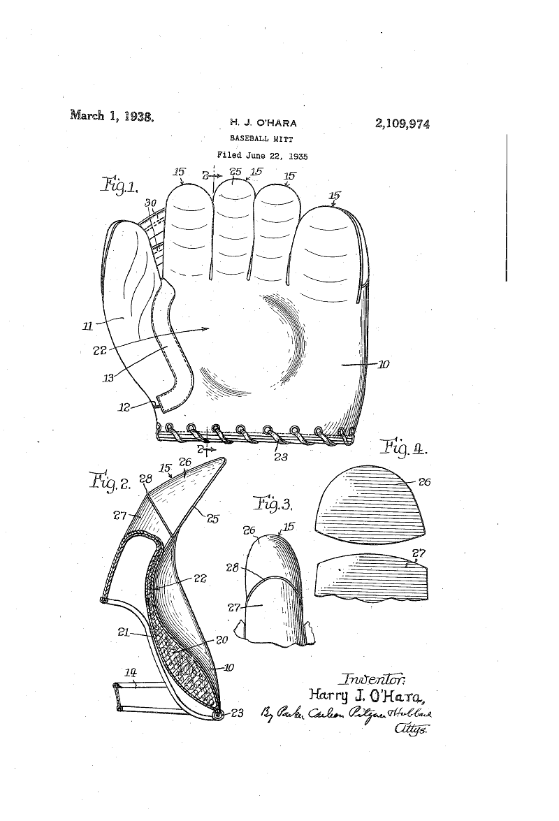 A ruling in 1956 from the U.S. Court of Appeals settled a lawsuit between Archibald Turner, inventor for Wilson Sporting Goods, and the inventor H.J. O'hara. At issue was the patent for the design and construction of a natural curve back on a baseball glove. O'hara's patent of 1938 is shown below. The curve of the fingers was created by transverse seams of the finger stalls.