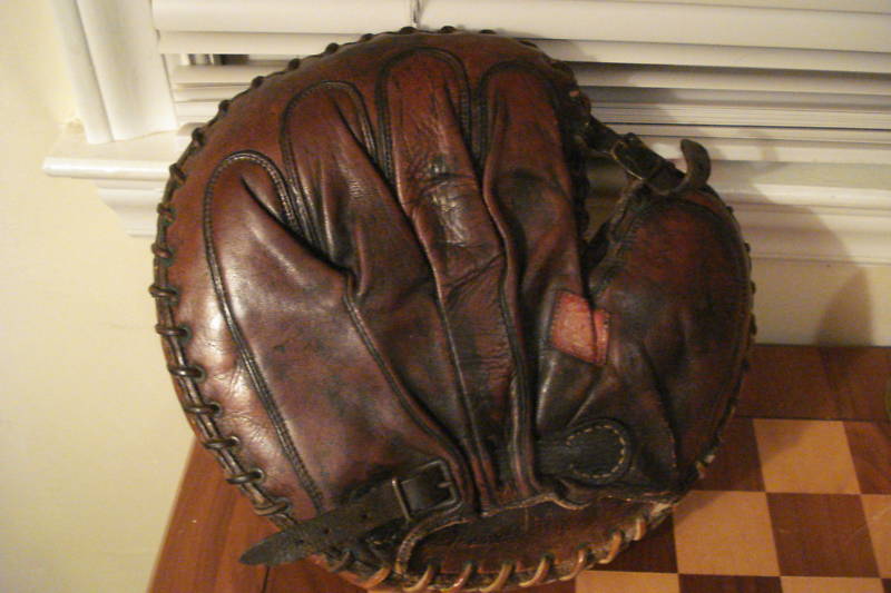 Circa 1930 Ken-Wel "George Selkirk" model for $110 on ebay. In good condition with a great cloth patch. Interesting back with the diagonal reinforcement above the wrist opening but no centered finger seams. For some reason I thought the two features showed up together.