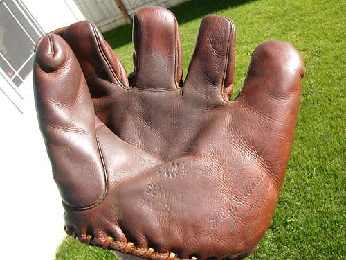 Circa 1930 Ken-Wel "George Selkirk" model for $110 on ebay. In good condition with a great cloth patch. Interesting back with the diagonal reinforcement above the wrist opening but no centered finger seams. For some reason I thought the two features showed up together.