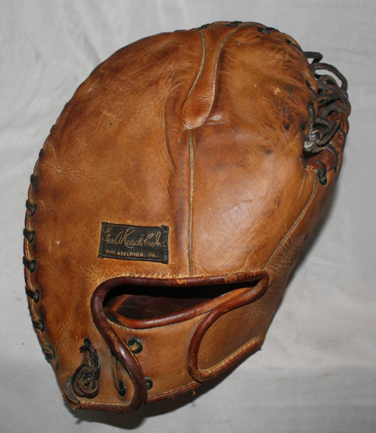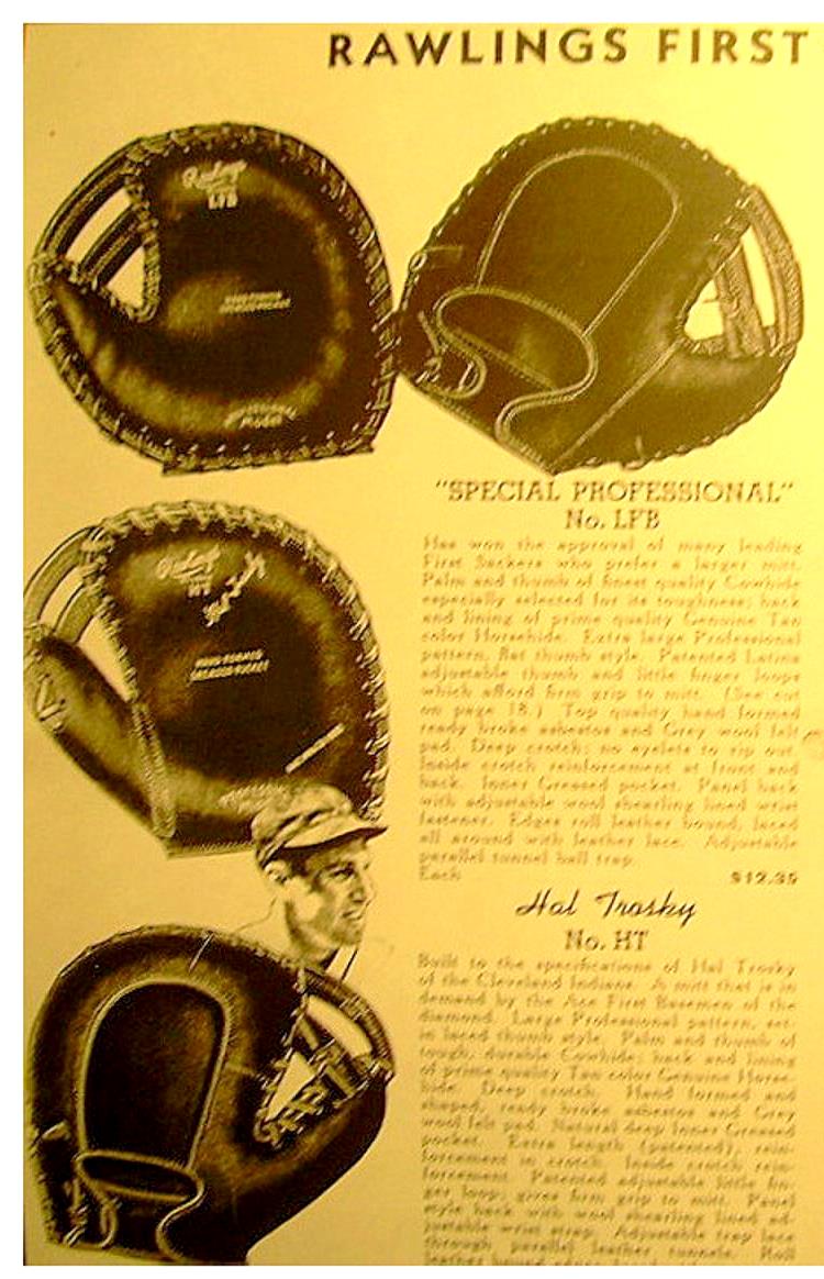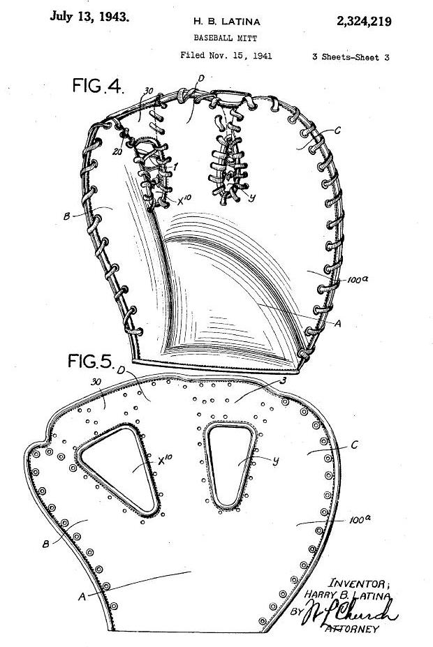 I selected the Latina "Trapper" to treat separately because there are a several different patent designs and variations. Mike Johnston's collection of "Trappers" is essential to include and there are side stories and amusing anecdotes. The story of the "Trapper" may begin with "Hammerin" Hank Greenberg, first baseman of the Detroit Tigers. In 1938 there were no rules about the type or size of a base mitt. Hank concocted a mitt that looked as big as a catchers mitt with a fishing net attached! A local scribe wrote this about the mitt. "The glove has 3 lengths of barbed wire, 4 corners, 2 side pockets, a fish net, rod and trowel, a small sled, a library of classics, a compact anti-aircraft gun, a change of clothes and a pocket comb." Pretty funny stuff! By 1939, rules were put in place by MLB limiting the sizes of gloves and mitts and thus ended Hank's experiment. It was a fortuitous time for Harry Latina and why he was so highly regarded as an inventor because by 1941 He revolutionized the basemitt with his "Trapper" design, replacing the older "Oven Mitt" style